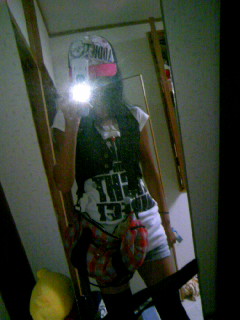 上からキャップ・ネックレス・Tシャツ・ベスト・ショートパンツ・ニーハイ・スニーカー・かばん